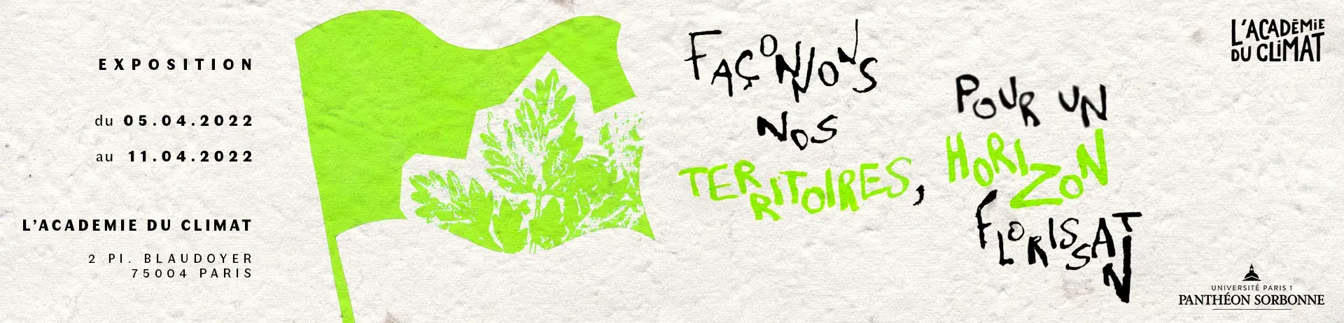 L'exposition Façonnons nos territoires, pour un horizon florissant se tiendra du mardi 5 avril au lundi 11 avril à l'Académie du Climat. Initiée par les étudiants en troisième année de licence Design, Arts, Médias, elle est le fruit d'un double travail : celui de la conception de drapeaux, emblèmes qui témoignent de leurs réflexions sur des problématiques contemporaines, puis de leur mise en place spatiale.